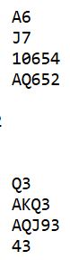 Her er et spill fra siste kamp i norgesmesterskapene i helgen. Det er av typen som kan avgjøre gullkampen når det er så jevnt som det var både i NM dame- og NM veteranlag. Du kan jo vurdere hvordan disse N/S kortene bør meldes: (Giver syd, Ø/V i sonen)