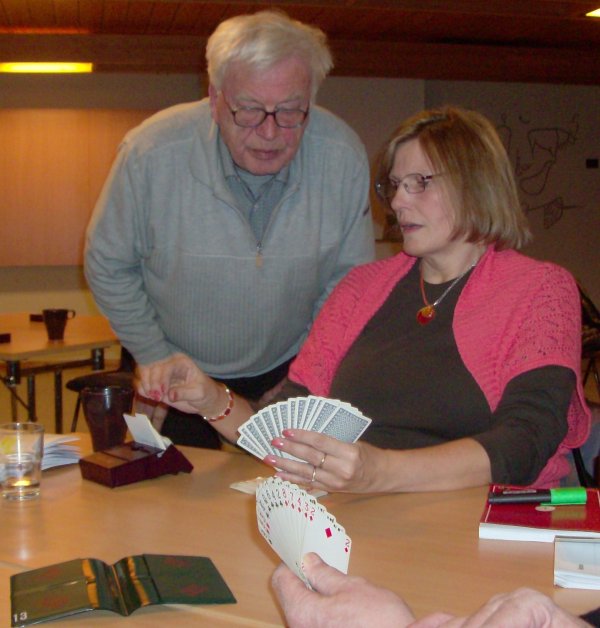 Glimt fra fjorårets sluttspill. Det blir en massemønstring nå til helga under KM-lag sluttspillet, med 12 lag i A og hele 14 lag i B-sluttspillet. På lørdag blir det arrangert nybegynnerturnering paralelt med lagturneringen og her ser det ut til at det blir 5 eller 6 bord. Kretstinget blir avviklet etter spillinga på lørdag, og etter middagen på kvelden blir det mulighet for facitbridge for de som ikke har fått nok. De som skal ha overnatting ordner dette direkte med kurssentret og prinsippet førstemann til mølla gjelder da vi blir et sted mellom 130 og 140 spillere til helga. Kampoppsettet vil bli sendt lagledere så snart vi har det klart. Ønsker alle vel møtt til en trivelig bridgehelg. Eva Falstad Flått er innstilt som ny leder i NBF Nord-Trøndelag. Bridgekurs Steinkjer: Anita Stavran stiller i nybegynnerpulja i helga og får her veiledning av bridgelærer Reidar B. Olsen. Saksliste kretsting finner dere her Årsmelding her Årsmelding KRU her Forslag til kretstinget her Valgkomiteens innstilling finner dere her Tidsskjema sluttspillhelg her Kvalifiserte lag med spillere i A og B finner dere her Påmeldte til nybegynnerturneringen her
