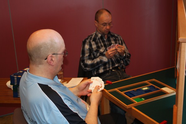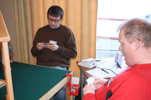 Namsos har fått opp dampen etter en litt ujevn første kamp og tatt teten etter de 2 første kampene. Første kamp var mot TopBridge. Denne kampen vant Namsos knepent 16-14. Noen tabber ødela for en større seier i den kampen. Davidsen - Nybo, Enge - Flått/Ringseth spilte første kamp. Frode Nybo i aksjon mot Nils-Otto Eliassen i TopBridge. Nils-Otto holdt ord når han sa han skulle være snill med Namsosgutta Kamp 2 var mot arrangørklubben Grand BK. En jevn første halvrunde ble fulgt av solid bridge fra begge par. Kampen ble til slutt vunnet klart 23-7 og Namsos har allerede fått en luke på 6VP ned til andreplassen. Butleren taler sitt tydelige språk etter 2 kamper. Frode og Ragnar er klart i tet med godt over 1 IMP i snitt pr spill. Det er langt ned til de neste på den lista. Ragnar og Frode har etter eget sigende spilt j... bra til nå. Vi håper det fortsetter En måpende Ragnar har tydligvis ikke pokerfjeset i orden Resultater finner du her På turneringens hjemmeside finner du bulletiner og bilder I morgen tidlig 09:00 spiller Namos mot Førde på BBO