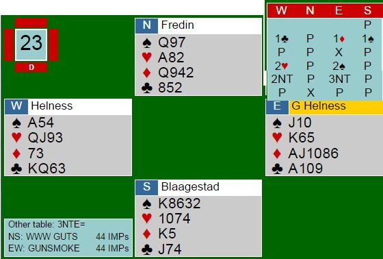 3NT gikk hjem på mange bord fordi det er "bare" å dukke spar to ganger, så kommer ikke syd inn for å hente beita. 1 + 3 + 1 + 4 = 9 stikk. Tor Helness gikk to dobla beiter. Kan han virkelig ikke en så elementær ting som å lasjere med et ess? Jeg er ganske sikker på at forklaringen er slik. Tor vet at nord har tre spar for sin dobling og når syveren (norske) komme ut til ti og konge, er det 50% sjanse for at fargen er blokkert. (D97 blokkerer, mens D87 bokkerer ikke) . Syd er favoritt til å ha hjerteresset etter sin innmelding i sonen, så derfor stakk Tor den første sparen og spilte hjerter. Han var sikkert skuffet når nord gikk straks opp med hjerteresset, men ble glad igjen når nord virkelig hadde spar ni. Spar dame og spar ni vant begge stikkene. Mer hjerter. Nå stod det jo igjen!! Tor tenkte videre. Nord har doblet med Dxx i spar og hjerteresset. Han har maks en ruterhonnør og den sitter ofte i kapp. Kløveren kan være stikkpotensiale, så der har sikkert Peter Fredin knekten fjerde. Derfor kløver til kongen og kløver til tieren. To beit, -500 og totalt 15 IMP ut når Jørn Arild Ringseth på det andre bordet lasja sparen og toppa kløveren. Bridge er moro!! _____________________________________________________________________________