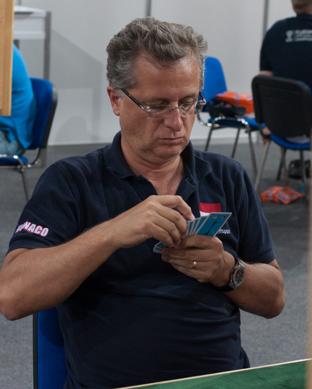 Det å lure motparten er en del av bridgen og når en går rett på limpinnen, må en bare bøye seg i hatten!! Thomas Charlsen spilte ut kløver åtte etter dette meldingsforløpet og da gikk 7sp lett hjem. Med et annet utspill går kontrakten fort beit, i alle fall fikk over halvparten av spillerne ikke mer enn 12 stikk ved å gå på ruteren. Det jeg videre skriver er referat fra loggen på BBO. Når Charlsen så Zimmermann sine kort, lurte han på hvorfor han ikke hadde cuebiddet 4kl eller 4ru? Zimmermann svarte i følge referatet på BBO. "No agreement. I wanted a club lead" Det var akkurat det han fikk og da burde samtalen sluttet her fordi det er helt opplagt at Zimmermann av taktiske grunner har hoppet over to (!) farger han har kontroll i. Makker i øst forklarte det som et normalt cuebid og hun meldte deretter. Selvsagt oppdaget hun at makker hadde kløveresset etter 4NT, men det måtte hun vel ikke si noe om? Neda. Det var ikke slutt. Turneringleder ble tilkalt og diskusjonen fortsatte. TL ga Zimmermann medhold i at alle meldinger skal være deklarert, men meningen med alle meldinger trenger selvsagt ikke forklares. Det kan da ikke vært forbudt å være smart På BBO ble det skrevet at NS ville appellere. Det får jeg for guds skyld ikke håpe skjedde. Da ville i alle fall jeg rødmet. Enda verre hvis det ligger en antydning i at 4hj var avtalt som en mulig melding over 3sp. Da er det i tilfelle (minst) uetisk og lista skal ligge himmelhøyt for å antyde at motpartens forklaringer ikke stemmer med avtalene. La det være klart. Alle bridgespillere kan melde akkurat hva de vil, så fremt makker ikke oppfatter ting på noen annen måte enn etter systemet. Ønsker du å åpne med 3sp på 18hp og gående farge, kan du selvsagt gjøre det. Men ikke mer enn en gang eller to hvert skuddår. Ønsker du å hoppe over cuebid eller cuebidde en farge du ikke har kontroll i, kan du selvsagt gjøre det såfremt makker ikke vet mer enn motparten. Det gjelder egne regler for åpningsmeldinger.Å åpne 1sp i tredjehånd med EKxxx i fargen og slutt, er ikke tillatt fordi det regnes ikke som bløff, men et avvik fra eget system og du vil gjøre det samme frekvent i samme posisjon andre ganger. Du kan heller ikke strekke 8-12 NT til 7 hp og i f.eks Ekrens er det påbudt å ha hender som passer til definisjonen. Grunnen til de to siste tingene, er at konvensjonen er destruktiv i utgangpunktet. Pierre Zimmermann lurte Thomas Charlsen opp på tribunen