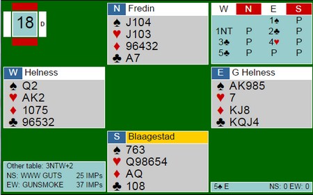 men ikke denne gangen. 4hj viser kortfarge og flytt makker sin EK i hjerter til minorhonnører så er 5kl rett kontrakt. Gi makker kløveresset og ruteresset, så står 6kl mens 3NT er beit. Kløver ut til esset og ruter til ED. En beit og 11 IMP ut mot 3NT - 11 stikk. Jeg vet ikke, men kanskje er 3ru en like god melding som 4hj, Gunn? Tredje farge viser hold og da får makker omtrent den samme informasjonen om at hjerteren er øst sitt svake punkt. Dere er enda under 3NT og har ikke brent de samme broene som 4hj gjorde? Likevel, maks uheldig da!! ____________________________________________________________________________