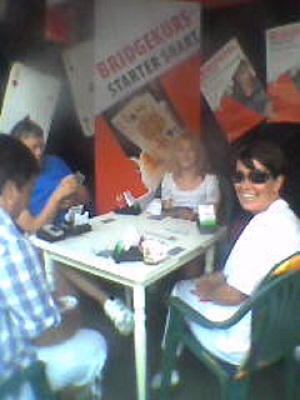 Under martna'n på Namsos hadde Namsos BK egen stand der folket kunne få et innblikk i vår vakre hobby. Det var for det meste pent vær, og mange fikk en liten smakebit på bridgen via forbundets "Lær bridge på 1 2 3". Som avslutning på martnashelga ble det arrangert et lynkurs. Dette kurset hadde 14 deltakere, hvorav den yngste var 8 år. Her kommer et spill fra lynkursets yngste deltaker. Klikk HER for å se spillet Eva har tatt noen bilder fra martna'n og fra det etterfølgende lynkurset. Disse følger under. Sara, Barnebarnet til Olav Hojem er på plass og vil lære seg bridge (mobilbilde, så litt dårlig kvalitet) Du finner flere bilder hvis du trykker på Les mer ...