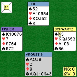 fordi dette spillet gjør at det er håp for de fleste av oss. Vinnerne av lagturneringa i Cavendish kom til 7ru dobla NS på dette spillet. Det var 1400 i beit i en frivillig meldt storeslem. Noen bedre?