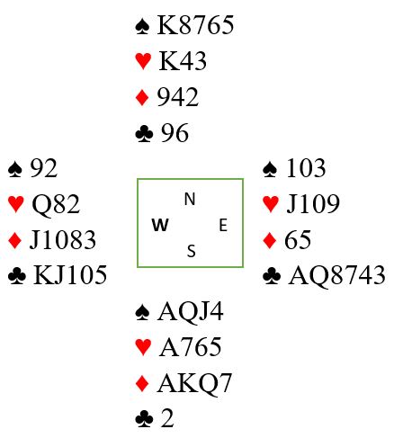 Syd åpner med Multi 2 ruter forklart som svake 2 i major, eller en sterk grandhånd. Nord melder 3 hjerter som er pass/korriger, dvs. nord sperremelder i tilfelle syd har svake 2 i en majorfarge. Nord har derfor bra tilpasning til begge majorfargene. Men syd kommer tilbake med 3NT som viser 20-21, normalt en balansert hånd. Utspill?