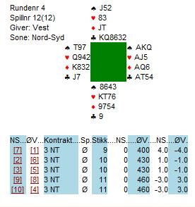 Det ble mye rot. Jeg må ha tastet feil WO par, og da ble det bare surr i starten. Hege og Elisabeth fikk WO både i runde 2 og 3, samt at feil parnummer spilte. Dette klarte jeg ikke å rette opp på kort tid, Derfor så ble det bestemt å spille Serie over 6 runder. Dette til ergelse for noen og glede for andre. Hege og Elisabeth var ikke så glade for igjen å få WO i 2. runde nå. Det ble ganske jevnt med Jan og Kjell Johnny som vinnere. Arne og Øyvind ble nummer 2 og en sterk 3 plass til Bård og Helge. Desverre så er det ikke rett spillestensil på resultatlisten, men ellers så er det rett. Siden vi kjørte amputert turnering så ble spillene fra 1 til 18 registrert og ikke 10 til og med 27. Jeg får se om dette kan bli rettet. RESULTATLISTEN