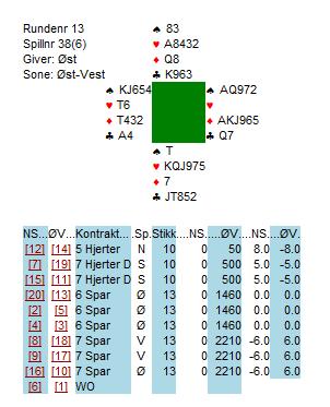 I juleturneringen (par) var spill nummer 12 et interessant tilfellet. Tommy Skodje og Petter Haram satt øst/vest , mot Gunnar Fylling og Harald Trengereid nord/syd og kortene var;