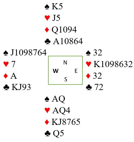 Da spillet forekom stakk spillefører den utspilte spar knekt med kongen og spilte hjerter knekt. Øst dekket med kongen, og syd vant med esset. Det lysnet litt, men nå fortsatte syd med hjerter dame. Da ble det bet siden det satt slik fra start: