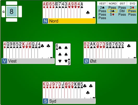 I spill nr 8 i KM singel spilte jeg mot selveste lagkaptein Antix fra laget vårt i NM-lag. Da er det prestisje ute å går, men i siviliserte former, faktisk så siviliserte at man gir tilbake gaver man får under vegs, så også i dette spillet. Rundt bordet satt; N/S; Andreas Kåre Rekdal-meg, Ø/V; Arnt Rune Rausand-Antix. Spillet så ut som du ser under og Antix startet ballet med åpningen 2 spar.