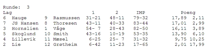 1,89 Erik Sælensminde - Boye Brogeland (Hauge) 1,74 Trond Are Nitter - Jan Kristen Lutro (Lutro) 1,47 Ragnar Davidsen (Davidsen ) 1,45 Jim Høyland (Høyland) 1,38 Terje Aa - Allan Livgård (Grøtheim ) Fra oppgjøret mellom Hordaland og Hauge. Fra venstre: Rune Hauge, Bjørn Bentzen, Tor Helness og Arild Rasmussen