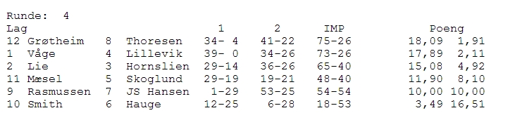 Rune Andersen er bekymret og ligger i nedrykksposisjon. Håkon Kippe vinner stort og taper stort, annen hver gang. Terje Lie spiller bra og har 1.20 på butleren etter fire kamper