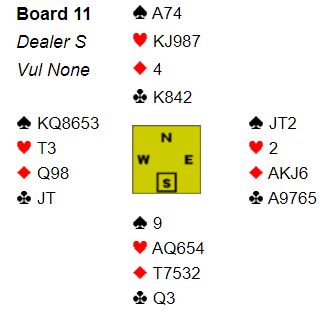 Det merkelige er at åpningsstilen - intervallet fra de beste kortene de kan ha og de dårligste - er så vill at det av og til gjør makkerparet som sådan litt passivt når det er snakk om å sperrre som svarer og åpneren har brukbare kort for sin åpningsmelding. Da tør de ikke tråkke til, og ender opp med å slippe inn motparten når de kunne fulgt opp åpningsstilen med en kilevink i tillegg til åpningen. Det var flere eksempler på dette. I dette spillet åpnet vest med en slags "Ekrens 2 hjerter" som viste begge major og maks 8 poeng. Her har jo vest en fin hånd for åpningen i sonen, men siden de gjør det så ofte med nesten ingenting (og kanskje 4-4 i fargene) selv i faresonen turde ikke øst å hoppe til 3 spar som virker opplagt. Han sa kun 2 spar. Makker Nick Jacob på syds plass doblet opplysende. Jeg sa 3 ruter som viste litt verdier, uten det ville det blitt Lebensohl 2NT. Syd sa 3 spar spørsmål om stopper, og 3NT ble kontrakten.