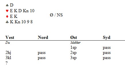 Det er sjelden noe som er fasit i bridge, men spiller under har en fasit hvis en tenker på hvordan "moderne" meldeteori har utviklet seg. Når vi har trumftilpass, er det mange måter å invitere på. Har vi ikke funnet tilpass og kanskje skal melde 3NT, er det også flere mulige invitter. Det som ofte er problemhender, er de gangene vi ikke har åtte trumf tilsammen og vi befinner oss i sjiktet mellom utgang og slem. Eventuelt mellom 6-trinnet og 7-trinnet. Derfor benytter mange 4NT som invitt til 6NT, såkalt kvantitativ 4NT. De mest vanlig er disse: 1NT - 4NT og 2NT-4NT. Det betyr at åpneren skal legge på med maks og passe med minimum. Noen ganger kan NT-åpneren melde en farge for om mulig finne en bedre slem på 4-4 tilpass. Dette vil også være invitt hos mange. 1sp - 2ru 2hj- 3kl 4NT Åpneren har (godt) kløverhold, men for gode kort til bare å melde 3NT. En typisk hånd vil være 5-4-1-3 evt 5-4-2-2 og ca 17-18 hp. Hos de parene som jobber med systemet sitt, er sekvenser som under typisk kvant. 1NT - 2kl 2ru - 3kl 3sp - 4NT 3kl er nytt spørsmål og 3sp viser 3-2-4-4. Hvis svarhånda vil spørre etter ess, må han først fastlegge en farge som trumf, f.eks 4kl. Nå vil en påfølgende 4NT være Blackwood. Dere ser sikkert poenget med dette, fordi han som svarer 3sp har vist fordelingen sin, men ikke vist styrken. Han kan enda ha 15 dårlige og 17 gode. Derfor er det fornuftig å ha 4NT som invitt. "Tommelfinger-regelen" er derfor denne: "Hvis den som melder 4NT på en enkel måte kunne fastlagt en farge som trumf, er hopp til 4NT invitt" Denne definisjonen må par med ambisjoner jobbe med og de må finne ut når den gjelder. Det er helt opplagt at enkelte ganger vil det være meningsløst at 4NT ikke skal spørre etter ess, selv om en strengt tatt kan finne mulige måter å melde annerledes på. En annen faktor som er viktig, er at tvetydige 4NT er en kilde til misforståelser, gjerne dyre misforståelser også. Derfor vet jeg at enkelte par, klok av skade, er forsiktig med å benytte 4NT som enten/eller. Jeg vet at Tor Helness og Geir Helgemo inntil nylig har vært av de parene som melder "enkelest". Ikke fordi at de ikke skjønner system, men for at de ønsker å beskytte seg selv mot katastrofer. Tilbake til spillet helt øverst er det opplagt at 4NT passer inn i derfinisjonen av kvant. Derfor melder både Boye, Espen og Jan Tore 4ru for å fastlegge sparen som trumf. Stian A Evenstad er også enig. Alle har planer om å gå i Blackwood med spar som trumf etterpå. Jeg vet ikke om det er symptomatisk, men jeg ser at spillere på vei opp og fram, gjerne går lengre veier og de kompliserer meldingsforløp. Marius Bartnes melder 5NT som "pick a slam". Har han virkelig tenkt å gi opp storeslemmen om makker har de sannsynlige tre nøkkelkortene spar EK og kløver ess? Klukken er redd for sparfargen som makker har meldt tre ganger og selv har damen i. Ja, 7kl/hj/NT kan være eneste storeslem om makker har f.eks EKn8765,52,542,ED, men hvordan i all verden skal vi klare å luke ut kløverdame uten å måtte gå glipp av sparkongen? Det er ikke første gangen jeg mener å se at de aller beste spillerne tar lettere veier til mål. I bridge er det ikke mulig å få med alle varianter og da må en noen ganger ta på støvelene med litt grovt mønster for å komme fram i søla.