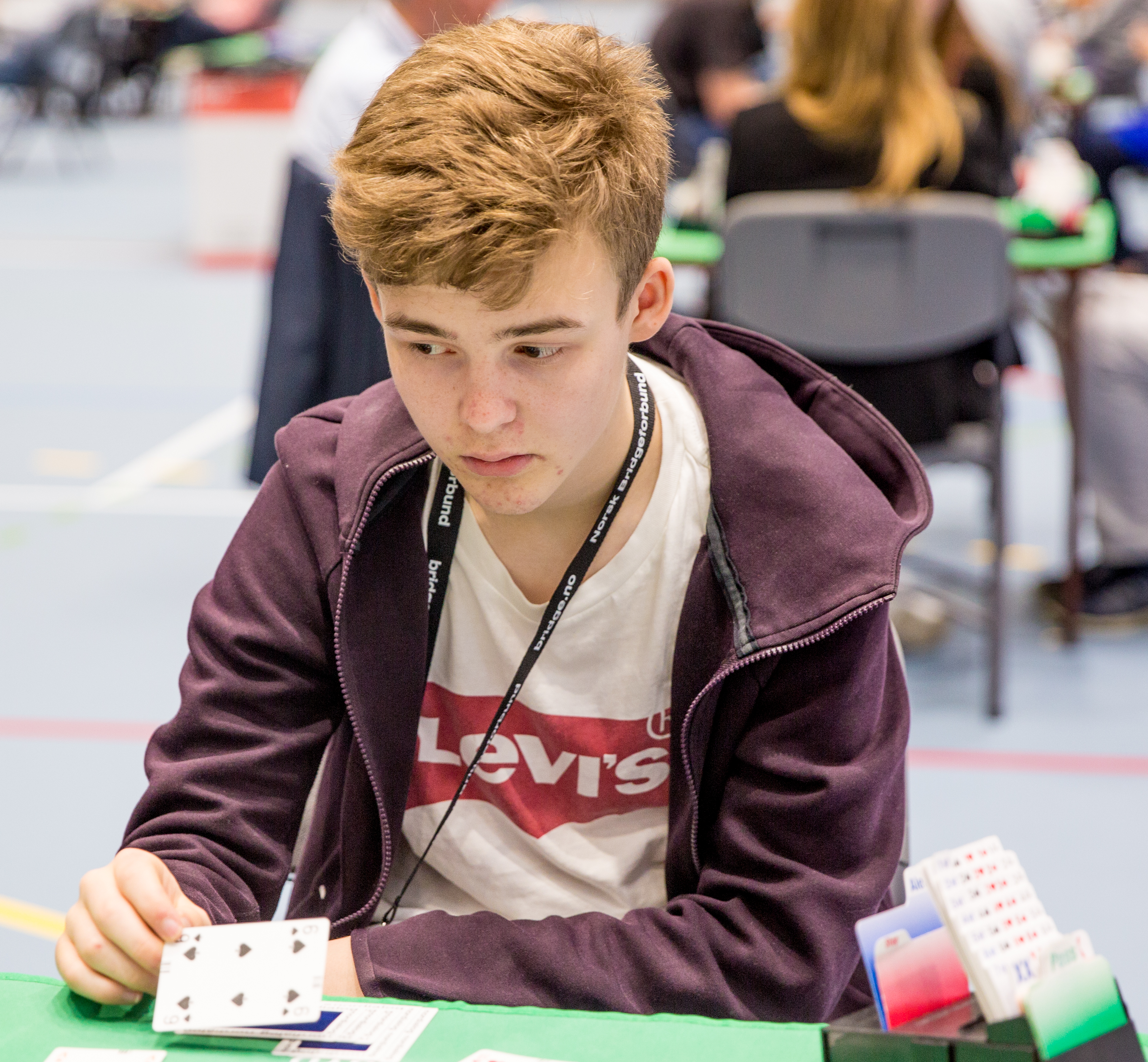 Markus begynte å spille bridge i 2014, men ble ikke aktiv før et par år senere. Han har spilt på det norske U21-laget siden 2017, men tar nå steget opp til U26. Han har to sølv og en bronse fra NM junior, og i våres kvalifiserte han seg til parfinalen sammen med sin far. Mange har sett Markus i sendinger fra NM og EM, men nå får dere sett han spille i stedet for. Han skal spille på U26 med Nicolai.