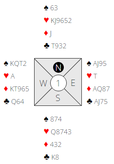 Ved flere bord passet likevel nord. Der Græsli-Løhre satt Ø/V skjedde det, og da fikk ØV melde uforstyrret. Øst åpnet med 1 kløver. De spiller med «kløverføringer» så vest sitt svar ble 1 hjerter som viste 4+ spar. Situasjonen er imidlertid helt lik som om det er 1 spar-svar som naturlig melding, eller og om det går 1 ruter i åpning og 1 spar fra vest.