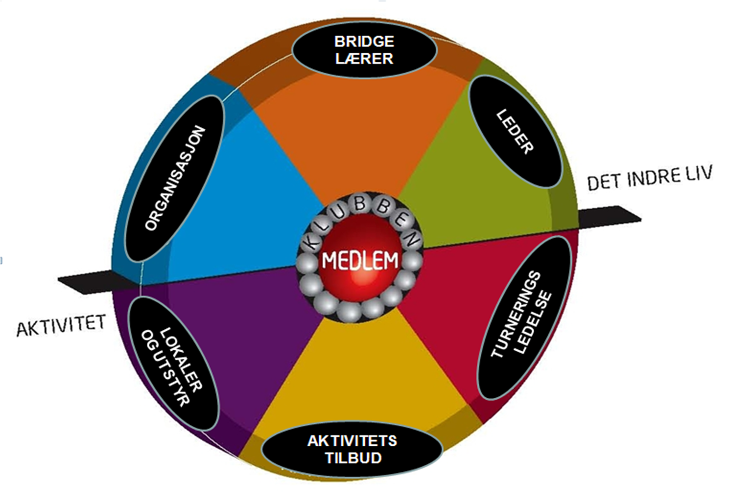 Organisasjonshjulet viser hvordan helheten i en klubb ser ut. Her deles klubben inn i seks viktige områder som klubben må ivareta. Denne analysen vil danne utgangspunktet for valg av spesifikk utvikling på noen områder i klubbene. Helhetlig klubbutvikling er virkemidler for å ivareta alle områdene i klubben, slik at alle områdene fungerer godt i forhold til hverandre.
