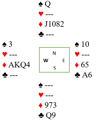 Det er forskjellige spilleplaner som kan funke her for å få alle tretten stikkene. Den enkleste er å spille A-K i ruter og trumfe en ruter før den siste trumfen er tatt ut. Faremomentet er at ruter sitter 5-2 og at den med dobbelton kan trumfe. En ruterstjeling gir ett ekstra trumfstikk (stjeling på den korte trumfhånden). Slik det satt ble det tretten stikk for de tre parene som var i 7 hjerter, og de som var i lilleslem fikk også tretten.