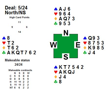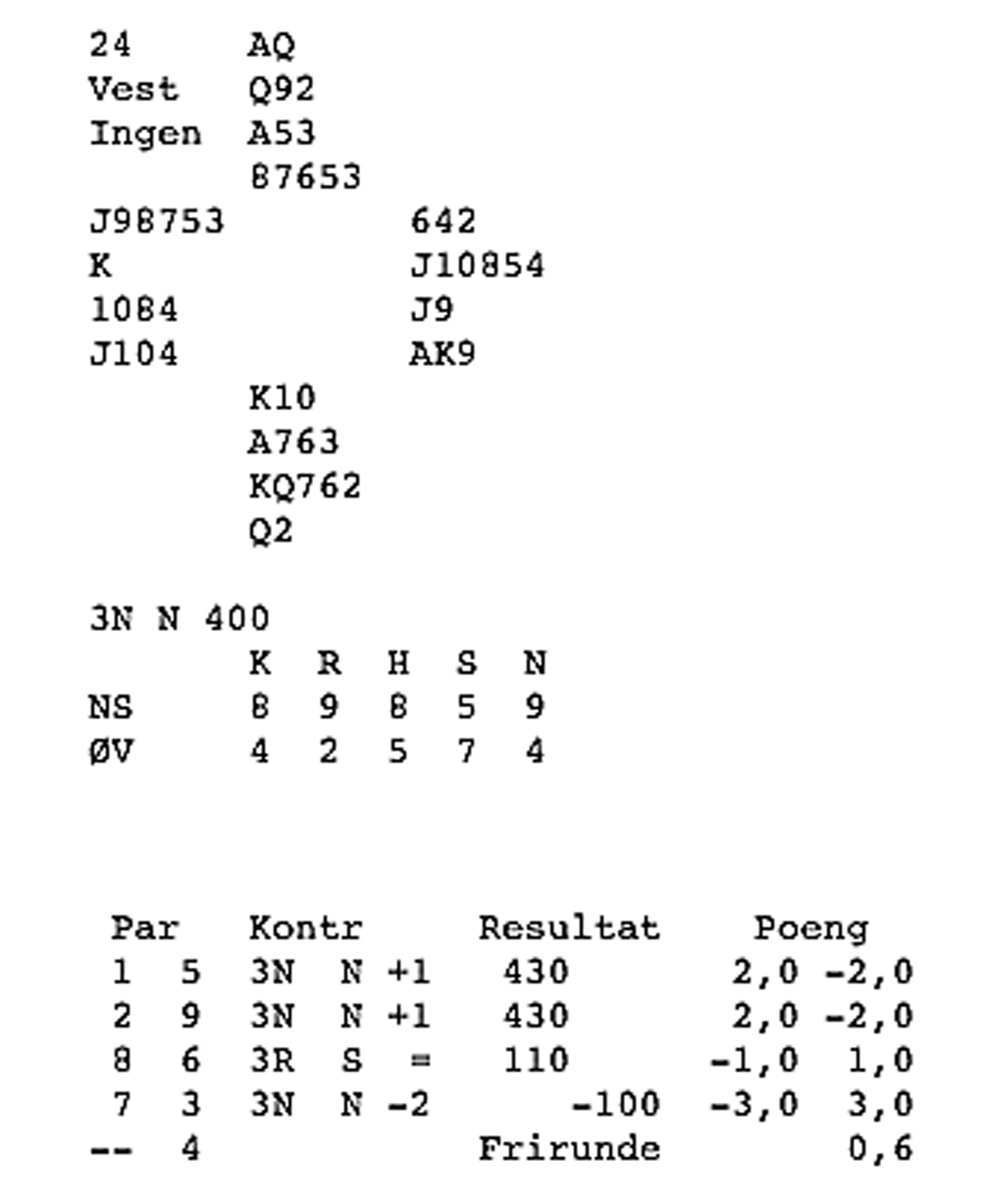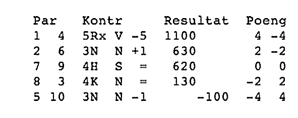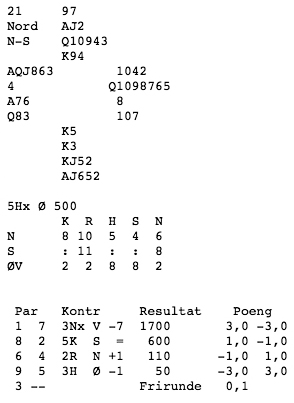 Meldingane gjekk slik: N A S V P 2 ru* 3 kl 3 sp 4 kl 4 sp 5 kl pass rundt * 2 ru = søppel-multi, 0-7 poeng