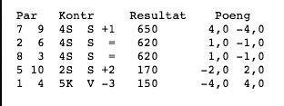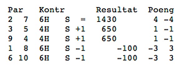 Resultata frå dei andre borda på spelet viser at fleire aust-vest par sleit i sparkontrakt: