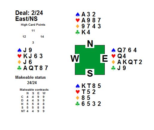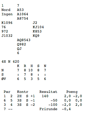 I eit uforstyrra ganske komplisert meldingsforløp enda det med at Thea i syd blei speleførar i 2 hjarter. No var Bjørn og Thea alt sikra eit greit resultat på spelet, då store deler av feltet (vi spelte simultanturnering så feltet var stort) kom altfor høgt på nord-syd sine kort, og gjekk beit. Men det skader ikkje å gjera eit godt resultat enno betre med ei god speleføring. Det var Dag i vest som hadde utspelet, og han valde ein liten ruter. Denne gjekk til kongen hos Frode, som fortsatte i fargen. Inne på handa i andre stikk freista det lite å gå på trumfen som var ganske tynn. Kryss-stelingar såg ut til å vera betre, så kløver til ess, og kløver til steling på handa tok dei to neste stikka. Spar ess og spar til steling gav to stikk til, og deretter blei ruter ess innkassert før nokon av motspelarane får sjansen til å kasta seg tom i fargen. Ny kløversteling på handa fulgte, og med fem kort igjen spelte Thea spar til låg steling i bordet. Aust kunne stela over, og held fram med trumf som esset i bordet vann.