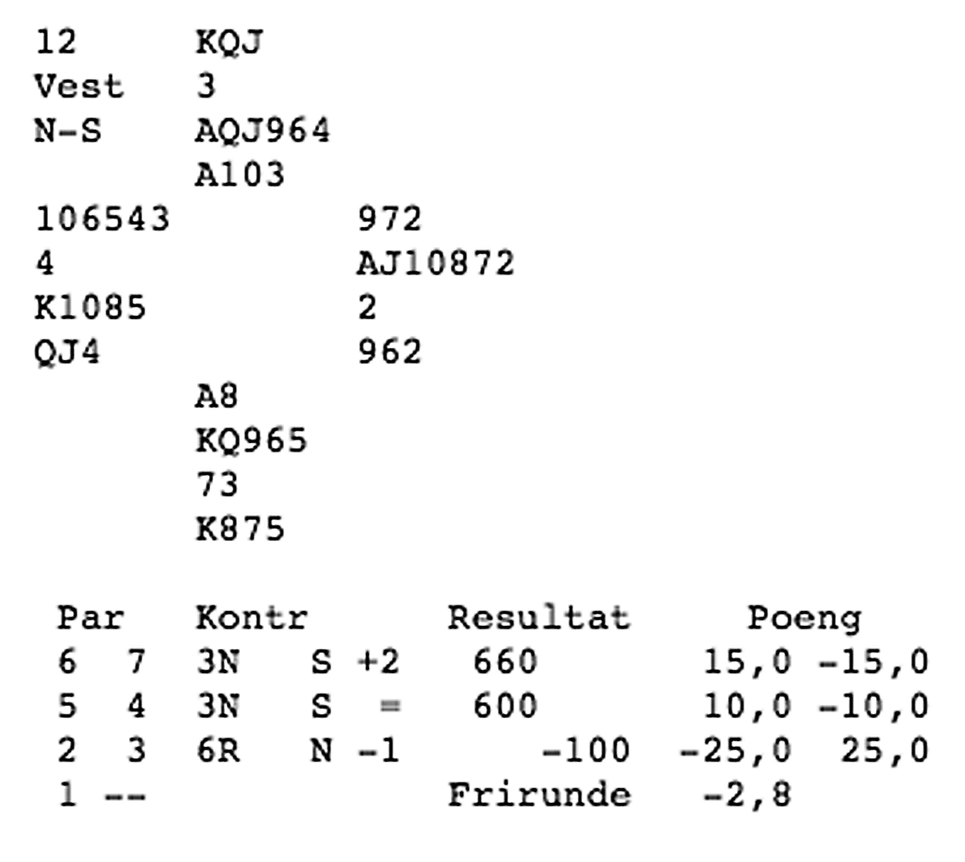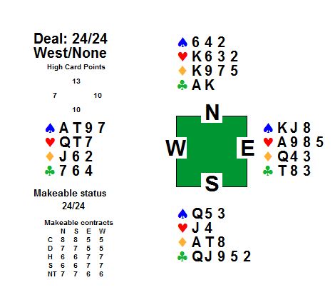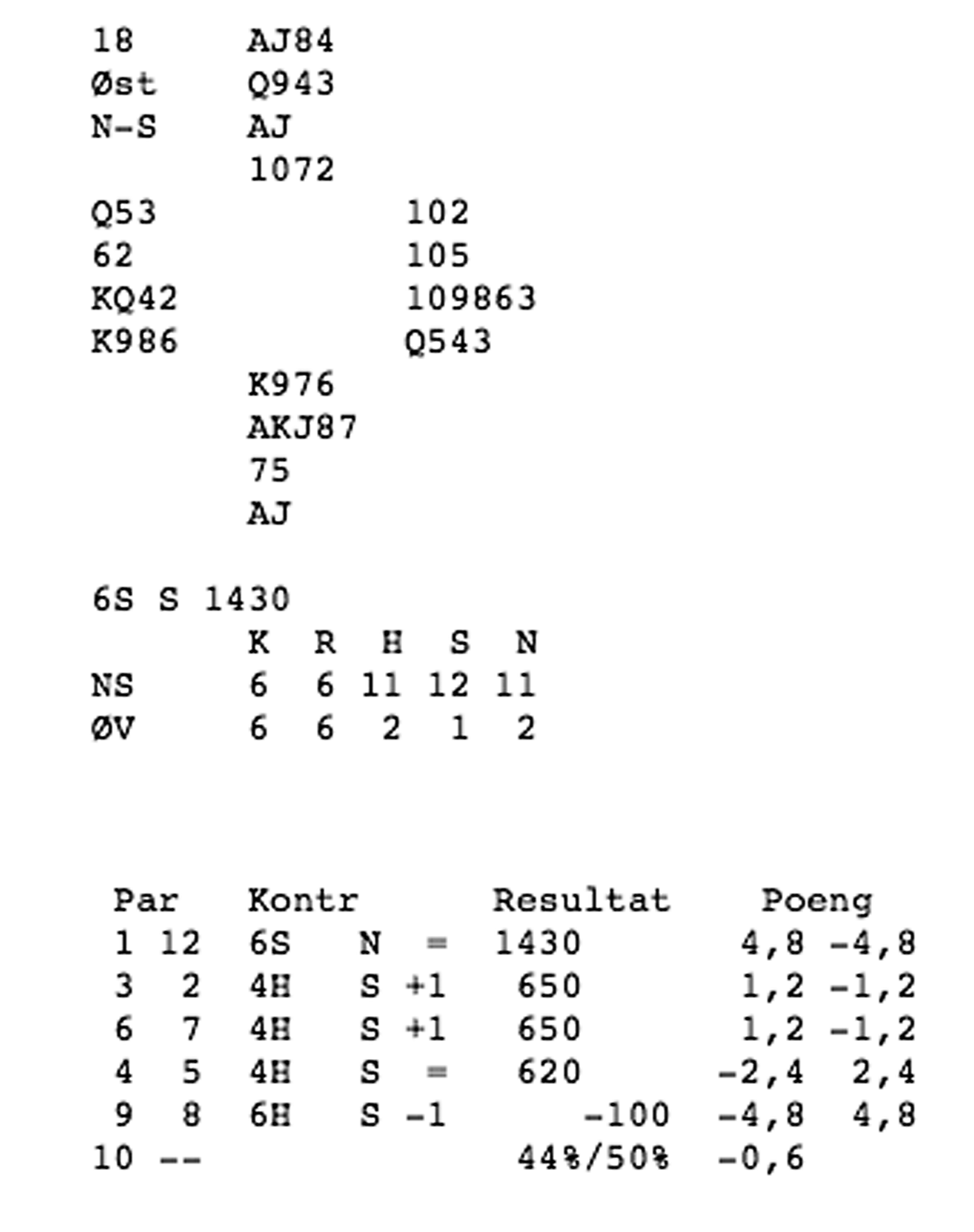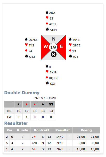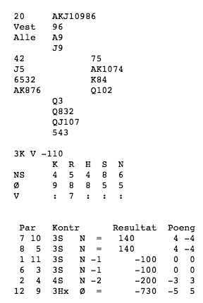 Første spelet var det tolv stikk i hjarterkontrakt. Ingen nord-syd-par klarte å melda denne slemmen, men ein speleførar fekk i alle fall tolv stikk. Dei som fekk mindre stikk har sikkert prøvd sparfinessen, men beste speleplan er sikkert å spela tre gonger spar frå topp og bruka ruter konge som inntak til dei godspelte spar-stikka. Det gjev 5 sparstikk, 5 hjarterstikk og 2 ruterstikk så lenge begge majorfargane sit 3-2 hos motparten. Neste spel var det enno fleire stikk, 13 i både spar og grand. 6 sparstikk, 3 hjarterstikk 3 ruterstikk og eit kløverstikk kunne innkasserast frå taket her. Til slutt var det aust-vest som hadde slem. 12 stikk i hjarterkontrakt denne gongen, og kun trumfen 3-1 imot gjorde at det ikkje var 13 stikk i dette spelet og. ---------------------------------------------------------------------------------------------------------------------