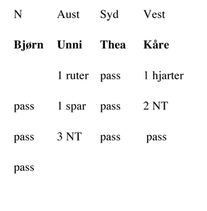 Etter pass i vest opna nord meldingane med 1 ruter. Stig gjekk inn med 1 hjarter i aust, syd letta til 2 ruter, og 2 hjarter frå Stein Ole avslutta meldingane.