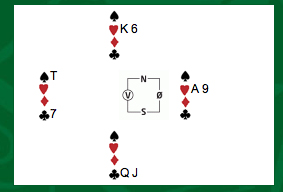 Anne Merete og Torhild vann spelinga denne kvelden, og dette spelet gav + 15 då dei held seg unna slemmen. Ordner ruterfargen seg utan taper er det ein god slem, men denne gongen måtte vest få eit stikk i fargen, i tillegg til hjarter-ess i aust, så då var det best å halda seg lågt.