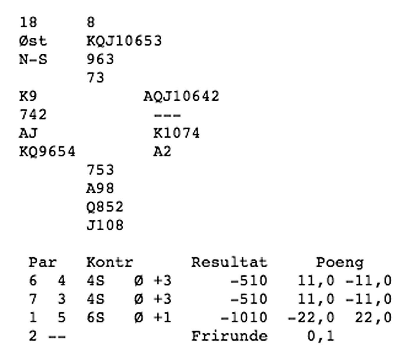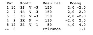 No fulgte kløver frå bordet, og den single trumf-dama på handa må gje stikk. «Eg kan velja mellom pest og kolera!» sa Frode og noterte 9 stikk på Bridgematen. 9 stikk gav ca 73,5 % score på landsbasis for nord-syd.