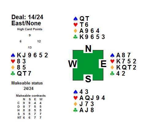 Joleiv og Jørn melde seg fort opp til 6 hjarter, med Joleiv i syd som speleførar. Spar kom ut, og esset vann stikket. Trumfen blei tatt ut i to rundar, og deretter tre rundar ruter frå bordet. Siste sparen på bordet blei så stolen på handa, og ruter-ess innkassert. To kløvertaparar ser ut til å vera uungåleg, men med litt hjelp frå motparten blei det berre ein. Kløver 7 frå handa, og når vest la kløver 3 var det bare å legga liten i bordet. Aust fekk stikket på kløver ti, men speleførar tok dei to siste stikka på kløver dame og kløver ess.