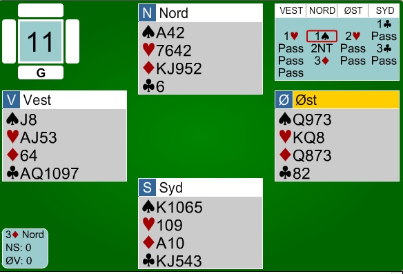 Karl Erik startet med å ta hjerter konge og dame, og alle fulgte. Neste kort som lå i disken fra den bolde junior var spar dame! Denne gikk til Essen hos Lasse, som fortsatte med kløver til knekt og dame. Terje spilte hjerter ess og Lasse trumfet i med bordets 10, før han spilte kløver hjem til stjeling med liten ruter. Ingen kan vel bebreide Lasse for å prøve en spar mot 10'ern nå, men da ble det teppefall. Terje stakk med knekten spilte ruter til ess i bordet hvorpå Lasse spilte kløver til stjeling og overstjeling hos Karl Erik. Spar 9 i retur fra Karl Erik til stjeling hos Terje, og ett stikk for hjerterknekt til slutt ble sluttresultat. Det ga en fin topp til Karl Erik og Terje, og en smultring til Lasse, etter et meget kreativt motspill.