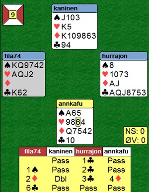 Joda, det er fint med couper og skviser, men de er ikke ofte de dukker opp. Jeg har tidligere sagt at godt håndverk er viktig, der mye handler om å gjøre lite feil. Et annet svært viktig moment er å treffe utspillene. Noen ganger er det selvsagt flaks, mens andre ganger kan en lese meldingsforløpet og kanskje sette seg inn i hvordan motparten tenker når de melder. Det hørtes ut som Karl Christian Baumann var forberedt på ruterutspill og sparen hans er sikkert rimelig bra siden han bykser til slem uten å ta makker med på råd. Kanskje kan det være et hull i hjerteren, tenkte Ann Karin Fuglestad? Ikke akkurat feil det og etter hjerterkongen tok sparesset det neste. En beit!!