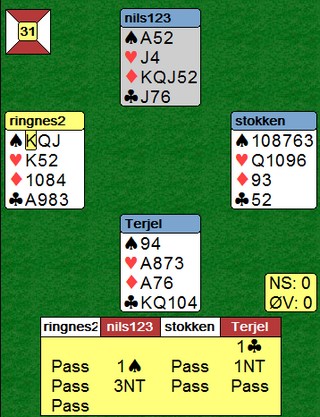 Det ligger masse, masse å hente i motspill i bridge. Min påstand er at det er her de aller, aller beste skiller seg fra de nest beste. Jeg prøver hver gang blindemann kommer opp å finne ut omtrent hvor mange honnørpoeng makker har. De fleste meldingsforløp vil kunne gi deg en ganske nøyaktig antydning av hans styrke, oftest med et intervall på to honnørpoeng. Neste skritt er å bruke den informasjonen til å finne rett motspill. Her er et eksempel på hva jeg mener.