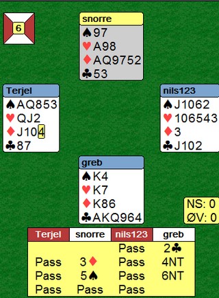 Gratulasjonene går til Hallgeir og Halvard som vant i kveld. Om et par dager blir resultatene forhåpentligvis å finne på forbundets hjemmeside under "resultater,simultanturneringer" i høyre marg. Der finner dere også kortene og alle "slippene". Vanligvis også en double-dummy analyse som sier hvor mange stikk som kan oppnås i hver farge av hver spiller. Lykke til!