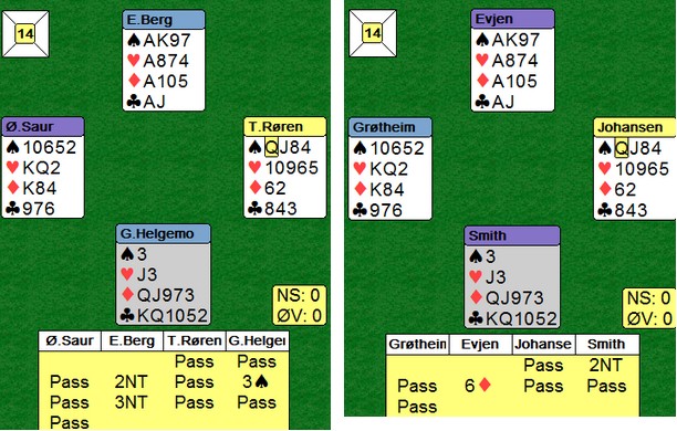 Så en god (heldig?) slem av Heimdal. Øyvind Saur fikk sparkongen ut til esset. Han fortsatte med ruter til bordet og kløver til kongen (!). Han tenkte sikkert slik at hvis en var kort i kløver, var det sikkert syd som hoppet til 3sp. Nå kunne ikke 3NT vinnes lenger. På det andre bordet la Glenn Grøtheim ned kløveresset tidlig og da spilte resten seg selv. D10xx kunne fanges opp og en hjerter forsvant på ruteren. Hjerteresset satt foran kongen og +920. Den scoren tror jeg ikke mange slår. Så var det Vikesund sin tur til å melde slem