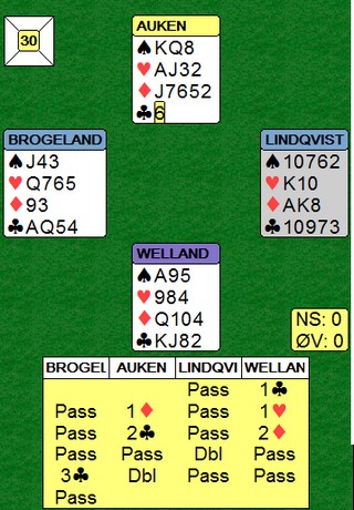 Espen åpnet i 2 hjerter som er en konstruktiv hånd, ca 8-11 hp med seks kort hjerter. At ikke Welland hadde til å melde seg på nå er et mysterium, selv om du ikke helt liker fordelingen for en dobling og ikke har hjerterhold til å melde 2NT. Undertegnede er sikker på at det allikevel er rett å doble, med 16 honnørpoeng må du komme deg på banen. Nå følte ikke Auken i Nord at hun heller hadde noe å bidra med, så Espen fikk spille 2 hjerter med to bet. Det ble 10 imp i gevinst når Hoftaniska og Charlsen meldte den opplagte 3NT'en. Det er sjeldent rett å la motparten spille en udoblet delkontrakt når din side har 28 hp tilsammen!
