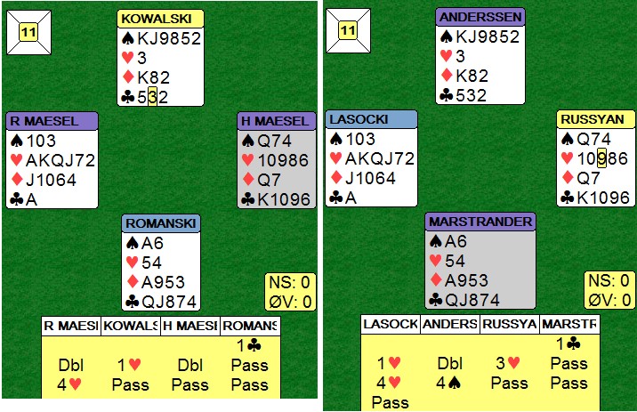20 IMP på et spill!! Var det for tidlig på morgenen for Roald? Mange av oss hadde hoppet i ruter tidlig, men Roald valgte å ikke presse motparten. Han trodde kanskje det satt skeivt og at makker hadde noe i kløver? På det andre bordet så det ut som Norge gjorde rett da de meldte over stampen, men en lightnerdobling og kløver ut gjorde slutt på moroa!! "også kløveren 3-0 med tre hos utspilleren da!!! Helv...." Hvem har kløverkongen? Bridge når vi ser alle korta er en helt annen idrett enn det spillerne opplever. Kan du gå beit i 4sp med hjerter ut? Ja, og det er kanskje beste spilleplan til og med å gå beit. Rune Andersen spilte åpneren for kløverkongen og dro derfor en liten kløver mot knekten (!). Hvis vest har kongen må han stikk med den for å få for den og da er det to ruteravkast i nord. Motparten får ett i hjerter, ett i ruter og kløverkongen. Nå ble det beit når knekten ble stukket av kongen og ruter igjennom. På det andre bordet tok spillefører kløverkappen og ingen tenkte vel noe på at ti stikk var unormalt? Har draget forsvunnet litt for Norge? Det kan kanskje virke som det er safe å kappe kløveren siden ruterkongen er beskyttet. På en måte er det to ruteravkast, ett i kløver og et på hjerterkongen. Det hjelper lite fordi det er den tredje som forsvinner på hver sin hånd. Vest spiller selvsagt bare en kløver til eller hjerter når han er inne på kongen. Kjør på, gutter!! Jeg synes Roald og Helge var passive i minst to spill i innledningen, men så kom dette fine spillet. Mange hadde nok meldt i 1hj i vest, men Roald velger å doble for etterpå å vise som en sterk hånd med hjerter. I gamle dager hadde nord hoppa til 2sp og øst være ute av meldingsforløpet, men nå fikk Helge vist hjerter og litt kort på 1-trinnet. Nord spilte ut makkers farge, kløver, fordi han hadde jo ikke fått signaler om noe annet. 10 stikk til Norge når en spar forsvant på kløverkongen. På det andre bordet tok Rune "stampen" i 4sp, men ingen kunne jo vite at han bare kødda, så ingen bjelle og 100 ut. Dårlig gjort, makker!! Jeg liker Peter sitt hopp til utgang. Denne gangen hadde makker utstyrt seg med honnører i hjerter og kløver, akkurat det han ikke skulle hatt. Flytt en av kongen til ruter, så er det fint spill for 4sp. Nå måtte spillefører ta seg helt ut for å gå bare ei beit. Neste gang utstyrer du deg med bedre honnører til makker, Rune Andersen!!!