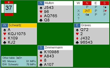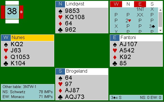 Tredje sesjon Den første store svingen var denne interessante 4sp-kontrakten. Espen og Boye stoppa i 3sp i det andre rommet. Schwartz spilte ut hjerter konge som Zimmermann lot vinne stikket. Jeg skjønner ikke helt logikken i fortsettelsen, men vest tok i alle fall for spar esset og skifta til kløver konge ! Nå ble det ti enkle stikk. Analyser er ikke min sterke side, men det ser for meg rimelig opplagt ut å fortsette i hjerter. Aktuelt stjeler makker og skifter til kløver. Nå er det ikke mulig å vinne kontrakten lenger fordi øst får enda en hjerterstjeling med spardamen når makker kommer inn på sparess. Kløverkongen kan heller ikke forsvinne. Schwartz var opplagt redd for at ruteren skulle gi avkast, men han kommer da inn på sparesset og kan skifte kløver hvis det skulle haste? Har spillefører KD10xx i spar, ser det tunt ut å beite. I spill 38 ble vel Boye vel ivrig når han meldte seg på over 1NT i øst? I alle fall hvis han ikke kan melde kløver naturlig. Det kosta 500 i 3kl, uten at motparten kunne vinne utgang. Så vinner Schwartz tilbake en utgangsving når han kapper hjerteren mens Nunes topper. 12 IMP. I lagkamper handler det mye om å vinne de harde utgangene. Over var et eksempel og her kommer et til. Nunes starter med kløver og da har Boye ti stikk. (4 + 3 + 1 + 2 = 10). Med noe annet enn kløver ut, sliter Boye med å få mer enn 4 + 3 + 1 + 1 = 9 før ØV henter sine fire stikk. Jeg liker Espen's 3 sp veldig godt. Ingen kan henge han for å passe 2sp som Moulton gjorde i det andre rommet, men Espen har flotte kort i sparkontrakt hvis makker har litt mer enn minimum. Denne gangen gikk ikke kløverkappen og spardamen satt heller ikke dobbel i kapp. Likevel føyk 4sp hjem. Jeg skjønner ikke hvorfor Fantoni - Nunes spiller to-åpningenene som de gjør. Det henger nok sammen med at åpninger på 1-trinnet kan være veldig sterke, men når 2sp kan være alt fra en vanlilg svake to til en åpningshånd, blir det mye beit. 2sp viser så vidt jeg vet 10-13 og minst femkort. Da må nesten vest invitere på en eller annen måte og paren kommer i dårlige utganger. I dette spillet satt EK i kløver rett, hjerteren 3-3 og sparen 3-3. Likevel er det ikke mulig å vinne mer enn ni stikk. Da er det noe galt. Graves - Schwatrz åpner med en god svake to spar og det går pass rundt. 6 IMP i gevinst.