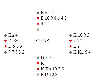 FLERE DAMER ENN PÅ MANGE ÅR Det er gledelig at damene også begynner å invadere de største turneringene. Å innvadere er vel kanskje ikke rett ord å bruke, men jeg kan ikke huske sist så mange som syv av 104 spillere er jenter. Aud Veseth ligger på en flott andreplass. Skal vi få damemedalje for første gang på lenge? FV: Rønnaug Asla, Pernille Lindaas, Astri Margrethe Grønnesby, Maja Rom Anjer, Torild Heskje, Anita Ower og Aud Veseth STILLINGEN ETTER DAG 1 ET SPILL MED MANGE SKVISMULIGHETER De fleste kom i 4hj i nord, men minst en spilte kontrakten fra syd og fikk kløver ut fra vest rett opp i ED. Det forsvant to ruter og elleve var sikret. Så hjerter konge, kløver til stjeling, ut med trumfen og en liten spar mot bordet. Øst stakk og nå lå kløver ti singel igjen i bordet. Det ble fristende for øst å ta for kløver knekt og fjerne bordets kløver 10. Det skulle han ikke gjort, for med fire kort igjen er dette stillingen: Jeg har fjernet vest sine kort fordi han er ikke med i spillet. På hjerter tre ser du sikkert at øst er ferdig. Det kom en analytiker inn til meg og sa at øst kan bryte denne skvisen ved å spille mer spar når han er inne på kongen! Javel, sa jeg, satte meg i nord og slapp sparen til esset. Nå tar jeg alle trumfene unntatt de to siste. Stillingen er: Jeg tar for den nest siste hjertern og øst er trumfskviset. Kaster han kløverknekten eller ruteresset, går det spar til damen og avkast av en spar på det godspilte kortet. Kaster han en spar, spiller jeg spar til damen og stjeler et minorkort. Spartassen gir det siste! STILLINGEN ETTER RUNDE 19 ALLAN LIVGÅRD TRAFF RUTEREN i dette spillet. Å få overstikk er jo det parturnering handler om og han spilte slik: Øst fant et greit utspill med hjerter fem. Allan vant med kongen, stjal en kløver, hjerter ess og hjerter 10 tok ut trumf. Så ruter til kongen (!), kløver ess og bort med den andre ruteren. Øst fikk to sparstikk til slutt. Et resultat i takhøyde. Jeg spurte Allan hvorfor han spilte til kongen og ikke tok kappen. "Sett deg i øst sitt sted og spill ut. Med ruter damen foran bordets femkort-farge, ville du ikke spilt ut aktivt? Når han startet med trumf, var det mye som tydet på at han hadde esset. Det jeg tenkte på, var om han kanskje hadde ED og at det likevel var rett å kappe. Det er også mye som tyder på at øst har sparkongen, siden han ikke startet der. Et argument for å kappe ruteren er at en kan gjøre seg uavhengig av sparfordelingen, men det er også skvisvarianter i sluttspillet bare jeg får beholdt overgangen i spar" DET ER KANSKJE DÅRLIG GJORT av meg å skrive om slike spill som det under, men hjerneblødende misforståelser er jo en del av bridgen? Jeg skal ikke en gang prøve meg på å fordele skyld, unntatt å si at det var Eide som meldte galt. PRISEN SOM FORSVANT? Terje Lie er en glimrende spillefører og når han traff sparen i dette spillet, gjorde jeg meg klar til å innstille han til prisen for beste spill.