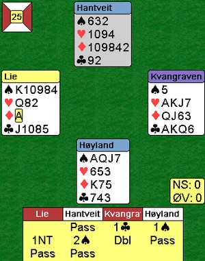 ______________________________________________________________________________________________ Kippe og Grude på vei opp og fram Det er ingen par som har scoret noe særlig. Å lede med 56,2% etter hundre spill, er lite. Dette betyr at det er mange par som er med i medaljekampen når dag to nærmer seg slutt. Selv de med middels enda, kan melde seg på hvis de får i gang sluttspurten. Stillingen etter 34 runder Helge Mæsel er god og myndig TL Nå begynner folk å bli slitne fordi gode spillere melder både fort og dårlig. Denne syd skal få være anonym, men han skammet seg etterpå. Nord viser "litt her og litt der" med sin dobling av 2ru. Da må syd på en eller annen måte komme seg i utgang. 4kl blir bare fight om kontrakten og alt for spedt. Jeg synes 4ru er en god melding som betyr at han har kort for utgang og minst to steder å spille. Aktuelt foreslår vel nord 4sp med dobbelton (har vel benektet tre i forrige runde). Det blir elleve stikk og hele +23 av 25. Selv 5kl med tolv ga +16. Ingen meldte slem, men det er vel ikke så rart. Pass er en undervurdert melding Når bridgespillere finner en steinhard utgang eller slem, roper mange over seg av begeistring. Når de samme tar en råsjans og gjetter på at makker har de ideelle kortene, blir de også (ufortjent?) oppskrytt når det lykkes. Å ta sjansen på at makker ikke har det som passer, er i mine øyne i samme kategori. Ofte kan det ligge en minst like god vurdering bak en pass.