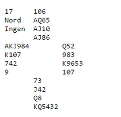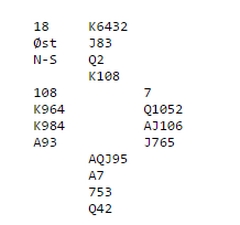 Det kom spar ut og Harald tok ut trumfen, fulgt at hjerter ess og mer hjerter. Motparten spilte en tredje som han trumfa. Så ruter. Hvis motparten hadde spilt tre runder der også, måtte Harald stjålet i bordet og angrepet kløveren selv. De røde fargene er eliminert og det er trumf på begge hende. Hvis øst hadde avslørt hjerterdamen og EJ i ruter, er det naturlig å plassere vest med kløveresset. Hvis ikke hadde øst fort åpnet. Kløveren er: K108 D43 og du ser sikkert hvilken kløver du må spille fra bordet. Joda, tieren!! Jeg vet ikke om Harald hadde klart det, men jeg ville ikke blitt forundret.