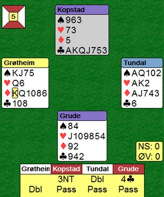 V åpner med pass, 1 hjerter fra N og Ø har egentlig ikke noen fornuftig melding å komme med selv om 13 HP er av åpning styrke. Pass også fra S, men nå vil mange i V «ballansere», doble (= 4 spar+ till til ellers) eller melde innpå 2kløver. N ga seg ikke, flere meldte 4 hjerter som ble doblet.