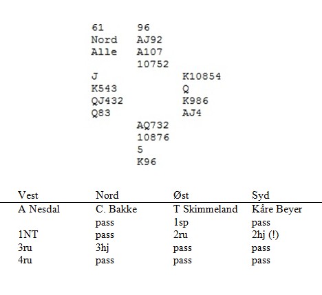 Hjerter 7 kom ut til liten knekten og damen, ruter ble spilt til knekten og esset. Nå fulgte en ny ruter, kløver beter vel men nå hadde Skimmeland sjansen til å vinne tror jeg. Han stakk i bordet og spilte spar knekt som Bakke la 6ern på og Thorleif la en liten spar før Beyer stakk med spar ess! Bakke kan utmerket ha 65 i spar, da har spillefører K1098 igjen om jeg stikker med spar dame og vil lett presse ut mitt ess og notere vunnet kontrakt. Inne på spar ess spilte Beyer hjerter 10 som Skimmeland trumfet og spilte spar konge, så fornøyd at spar 9 kom fra unge Bakke og var ikke i tvil om hvordan fargen satt. Spar til stjeling og overstjeling til Skimmelands store sjokk og han måtte notere en bet i kontrakten han var sikker på han kom til å vinne.
