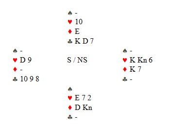 Ikke unaturlig spiller du ut liten hjerter til knekten hos makker og kongen i øst. Etter en normal tenkepause spiller øst spar-dame fra hånda, og hva gjør du?