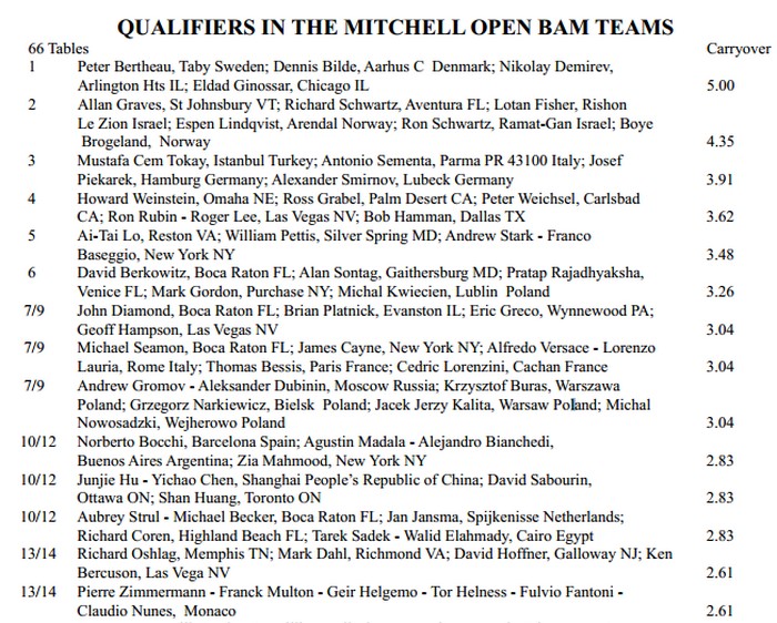 I Nationals Fall er det Michell Board-A-Match som pågår. Der er det nå 42 lag som skal kjempe om seieren. Hvis jeg har forstått rett, har lagene med seg Carryover-scoren som du ser under. Ikke så mye, men i BAM er ett poeng et helt spill. Ikke minst når lag kommer likt, er det fint å ha desimaler i Carryover. Det er tre norske med i finalen. Boye og Espen er best med andreplass og 4.35 med seg i sekken, mens Tor og Geir ligger på 13.plass. Kristian Ellingsen og Tor Eivind Grude kom seg også med i finalen som et av de siste lagene. Boye skriver også på sin side