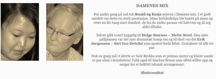 er et årlig arrangement der kun damer får invitere og vi menn kan ikke si nei uten helt spesielle grunner. Det er god mat og pent tøy. Årets arrangement ble like suksessrikt som før om årene og jeg har stjålet fra kvangraven.no.. RESULTATER