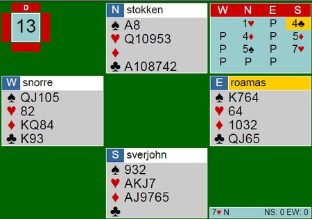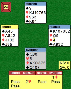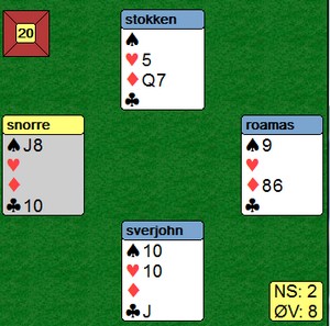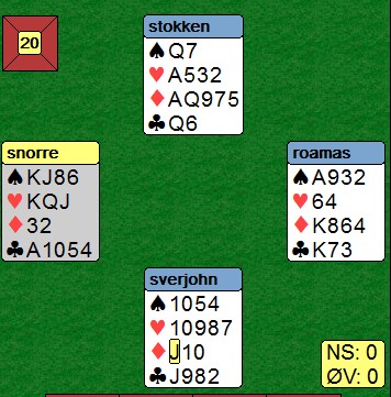 De fleste var så vidt i utgang i spillet under. Det var ikke Sverre Johnsen og Åsmund Stokkeland. Tretten stikk var mulig å vinner på flere måter, blant annet ved å stjele tre kløver i bordet.
