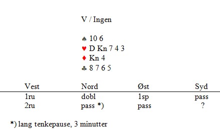 (Hvis noen av dere lesere har kommentater, er det fint om dere skriver noen ord etter artikkelen) Ordet "tenkepause" gir de fleste turneringsledere sjelvinger i ryggmargen. Det er lite som setter følelser så mye i sving som når en blir bortdømt fra en melding som i eget hode var 100% opplagt. Reglene er klinkende klare hvilke rettigheter du har når makker melder "pass" etter å tenkt mer enn det som kan ansees som normalt. Det spiller ingen rolle hva du mener er en normal melding, men det som er avgjørende er hva andre spillere på ditt nivå ville gjort i samme situasjon uten tenkepause. Dette forklarer Allan Livgård bedre lenger nede. Jeg husker generalsektretæren var på besøk i Kristiansand i fjor sommer og spilte sommerbridge med Marianne Harding. Hun tenkte lenge etter motpartens melding på 5-trinnet og valgte så å doble. Knut Brinchmann tok ut doblingen fordi han mente det var helt opplagt, uavhengig av tenkepausen til makker. Vi andre rundt bordet lot meldingen stå siden det "bare" var sommerbridge, men sa at i en større turnering ville Knut etter all sannsynlighet blitt tvunget til å si pass. "Men jeg hadde en helt opplagt 5hj", sa han. "Det er jo ingen mening i slike regler!!" Du er ikke den første som har sagt dette, Knut, men når makker tenker og så sier pass, ligger dere tynt an. Derfor er det mange ganger en bedre løsning å melde når en først har tenkt lenge. I alle fall er det dumt å melde i posisjoner der en "vet" at en blir dømt mot. Var aksjonen mislykket og motparten får en god score, beholder de den. Var den vellykket, blir du dømt til å si pass. Noe som irriterer meg, er at terskelen for å tilklalle turneringsleder er så forskjellig hos norske spillere. Vi vet alle om spillere som roper ved den minste mistanke om formelle feil, fordi de kjenner sine rettigheter og vet at TL ofte ikke har noe annet valg enn å dømme i fordel den som protesterer. Selv om de aller fleste vil anse at skaden som har skjedd er minimal, i mange tilfeller ubetydelig i praksis, men mulig i teorien. Jeg fikk en mail fra Paul H Hinna om et spill i hans klubb. Det så sånn ut: Syd meldte 2hj, selv om makker hadde tenkt svært lenge. Det er opplagt at makker ikke har en normal opplysende dobling, men på den annen side er det ikke så lett å finne ut hva han tenkte på. Mange vil mene at syd har en opplagt melding med en fin femkortfarge der makker normalt har tilpass, i tillegg to dobbeltoner i motpartens farge. I alle fall siden han hadde passet i første melderunde. Andre vil ikke tenke på å melde en gang med bare fire honnørpoeng. Syd vil helt sikkert hevde at han gjorde som han ville gjort uavhengig av makkers pause, men gir reglene han lov til det? Paul A Hinna dømte at syd ikke kunne melde, men det skjedde ting i meldingsforløpet etterpå som gjorde at han dømte spillet 50-50 til begge sider. Jeg kan ikke dette og har fått to av våre flinke turneringsledere til å si noe. Takk til både Tom Høiland og Allan Livgård. Tom Høiland