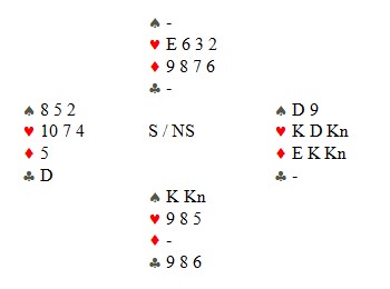 A: Øst kommer inn på damen, men har ikke trumf å spille. Han fortsetter sikkert med hjerter kongen. Bordet vinner og en ruter stjeles. Så spar konge fra hånda og du ser sikkert at vest ikke kan få flere sparstikk. B: Vest stikker opp med esset og forsetter med kløver esset og mer kløver. Syd vinner lavt hjemme og tar for kongen. Nå er stillingen: Nå spiller syd hjerter og legger liten i bordet. Øst vinner og spiller f.eks ruter til stjeling på hånda. Syd gir bort også det andre hjerterstikket, men tredje gang vinner bordets ess og på den trettende forsvinner spar knekt på hånda. Vest må stjele med et orginalstikk. Hvis motparten prøver seg å spille spar, bruker syd knekten. Moral: Det er normalt helt feil å spille fra KKn, men noen ganger er det gale riktig!