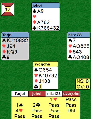 Dette spillet er fra siste klubbkveld og er et eksempel på at man må ta med seg alle sjanser for å finne det som resultere i et ekstra stikk.
