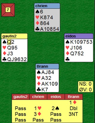 Han fikk spardamen i utspill og når øst la styrke lot han damen vinner og fikk som forventet mer spar. Nå kastet bergenseren en hjerter i bordet og med åpne kort så det ikke heldig ut. Du ser hvordan ruteren skal spilles for tre stikk, men det er ikke opplagt.